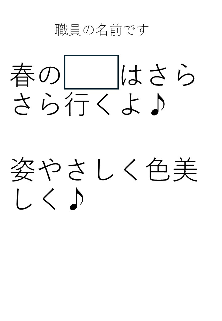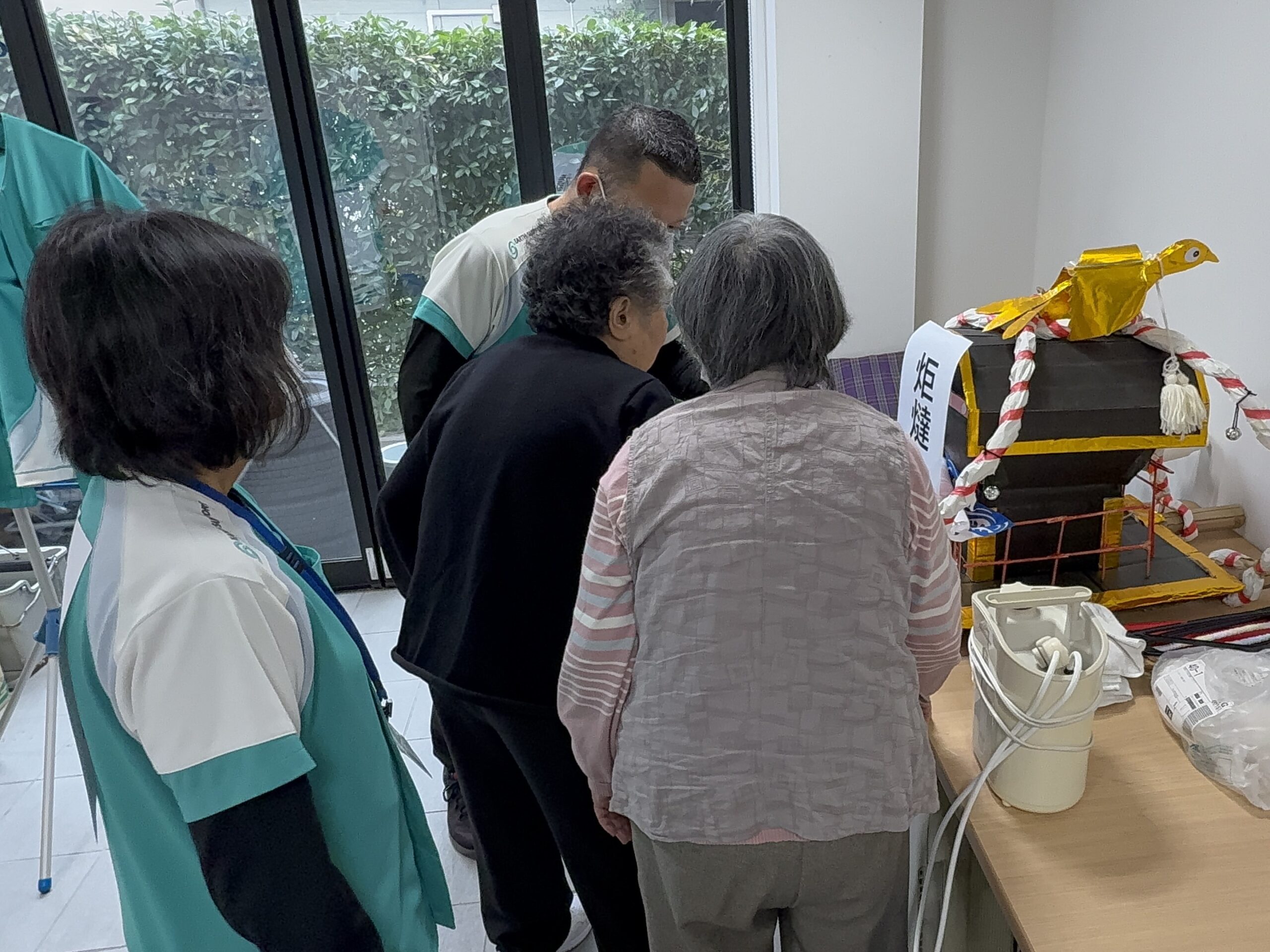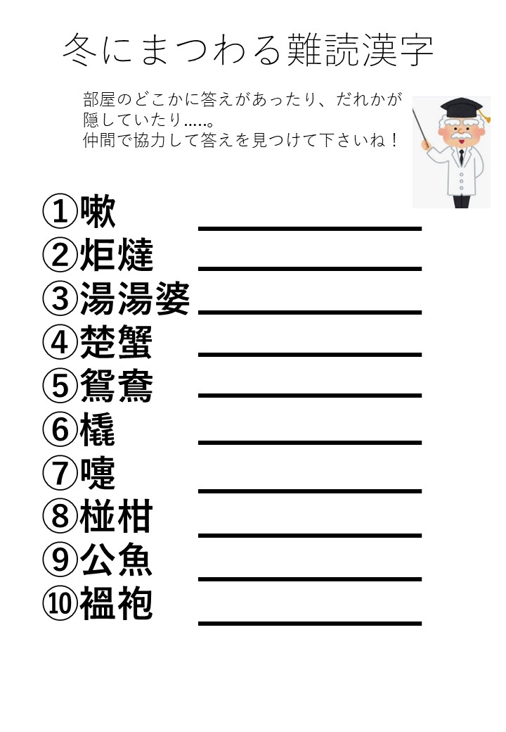 4~5名のグループに分かれ、10個の難読漢字を答えていただくゲームです。お手元のヒントを手がかりに、デイサービス内を歩きながら、ロールカーテンやスタッフの背中など様々な場所に隠されている答えを探していただきました。