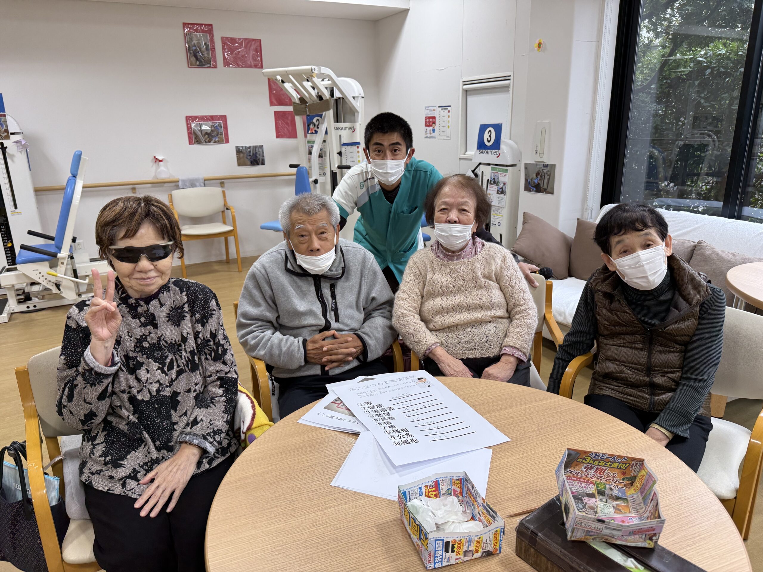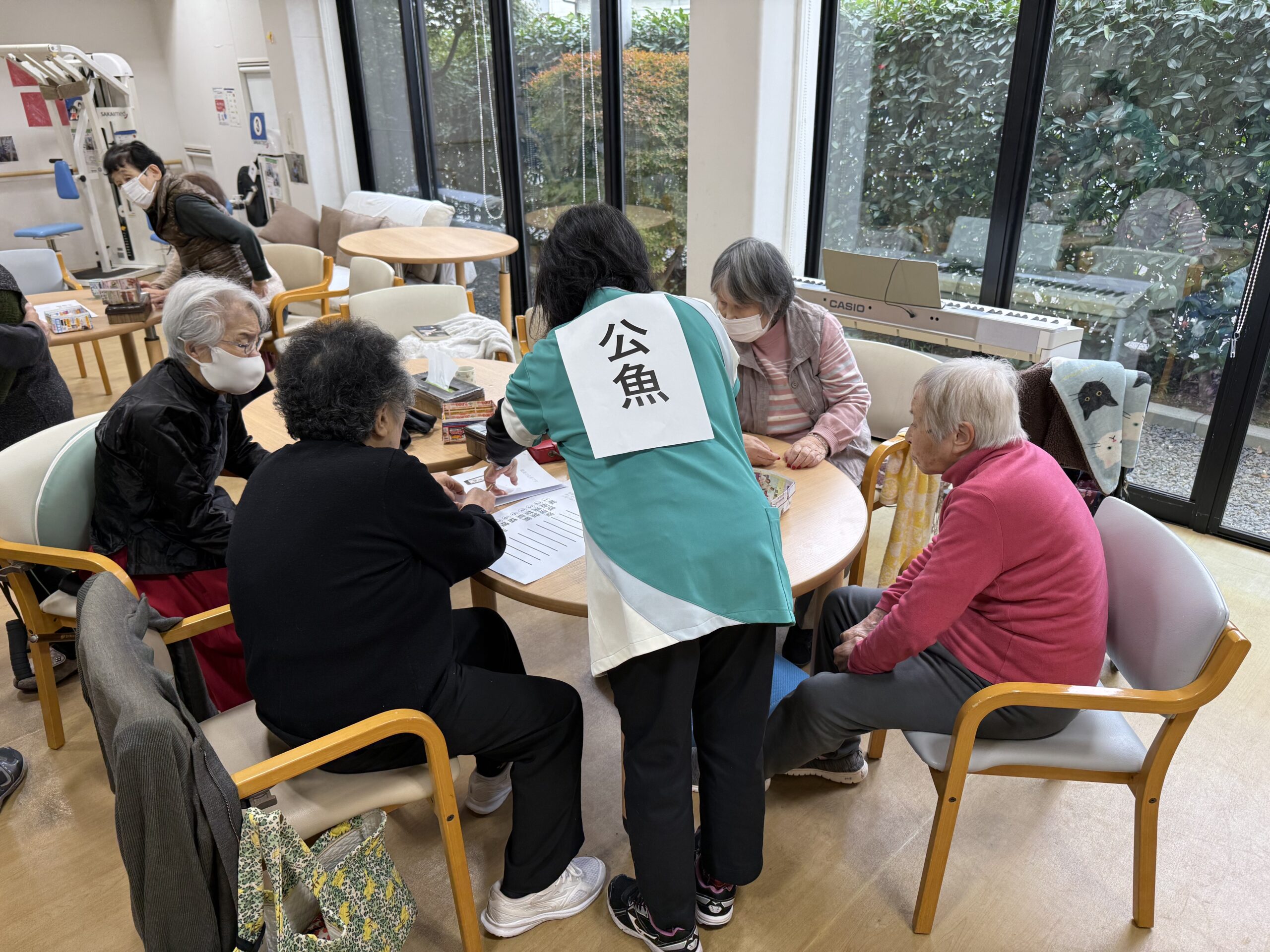 お身体の状態や認知症の進行に合わせ、カラオケで1曲歌うと答えを1つお伝えするなど、皆さまが参加できるよう工夫を凝らしました。ゲーム中はいつも以上にお客様同士の会話が弾み、笑いの絶えないひと時となりました。
