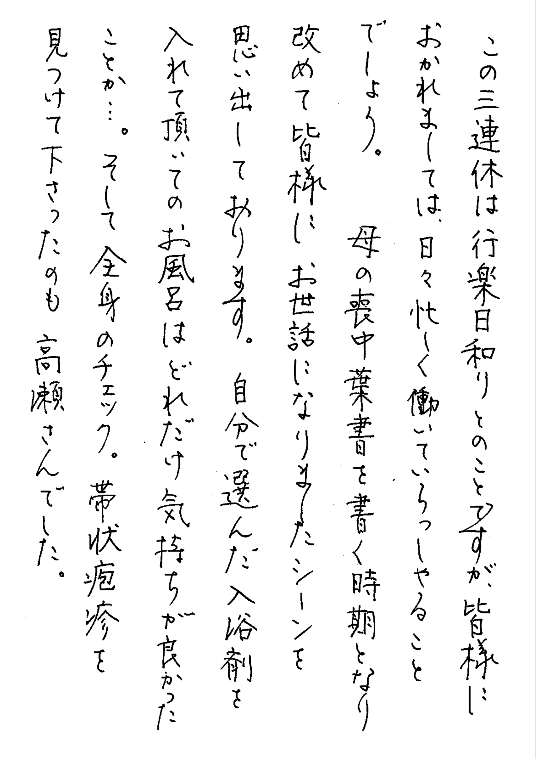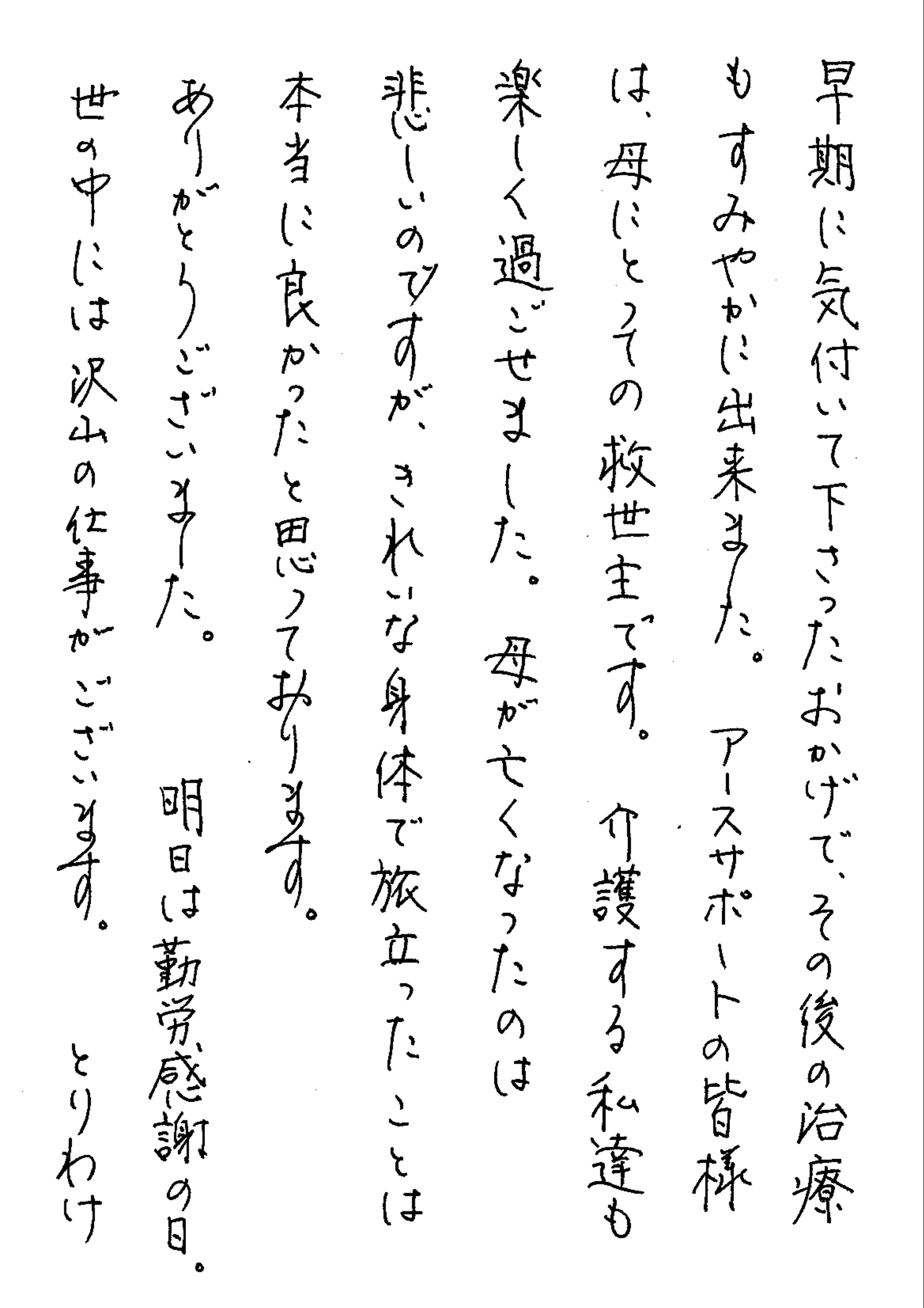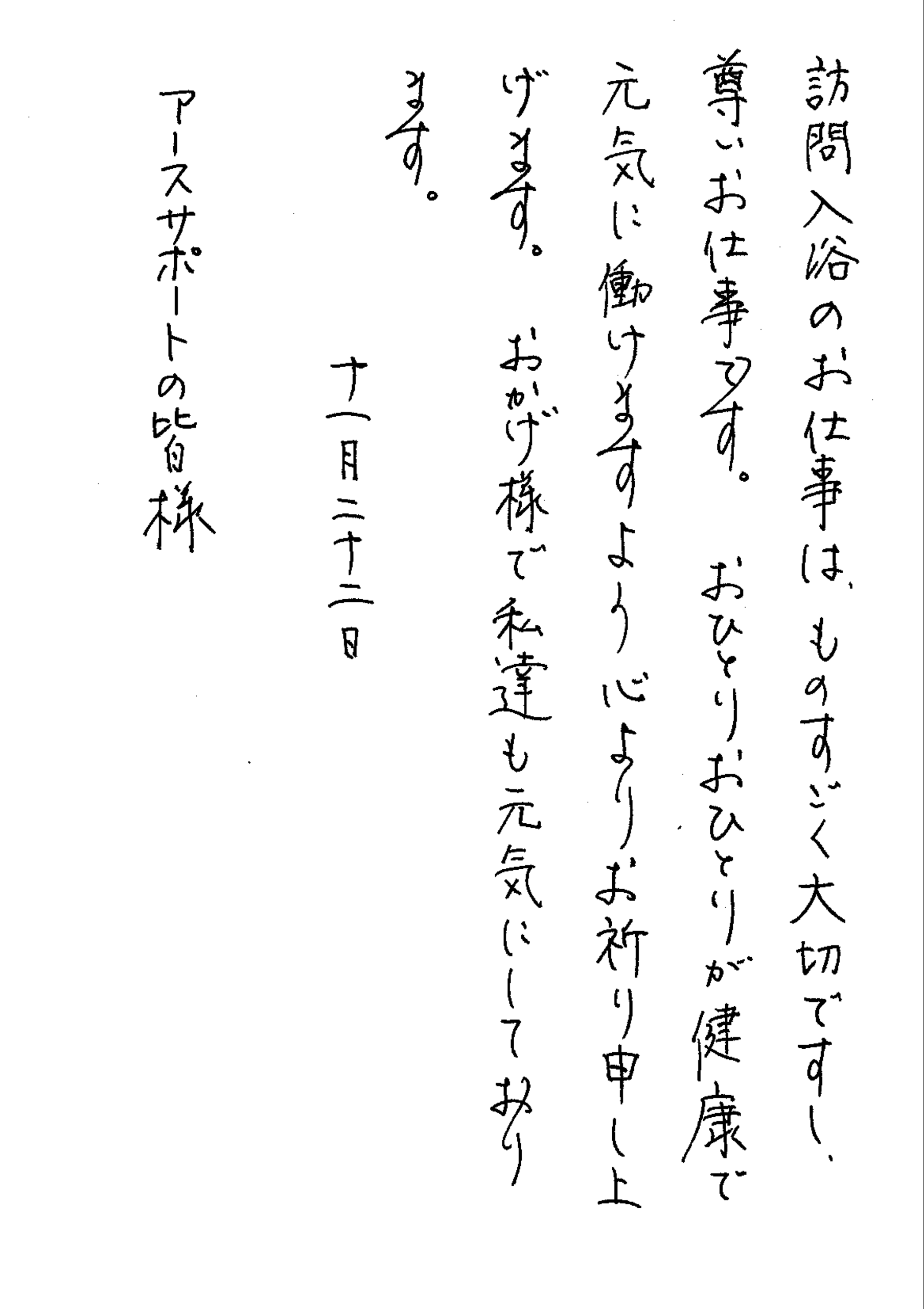 当社では、訪問入浴を始めとする在宅介護サービスを中心に、お客様の日常生活をサポートしております。今回は、宮城県にある「アースサポート塩釜」の訪問入浴をご利用いただいたお客様からの2通のお手紙をご紹介します。