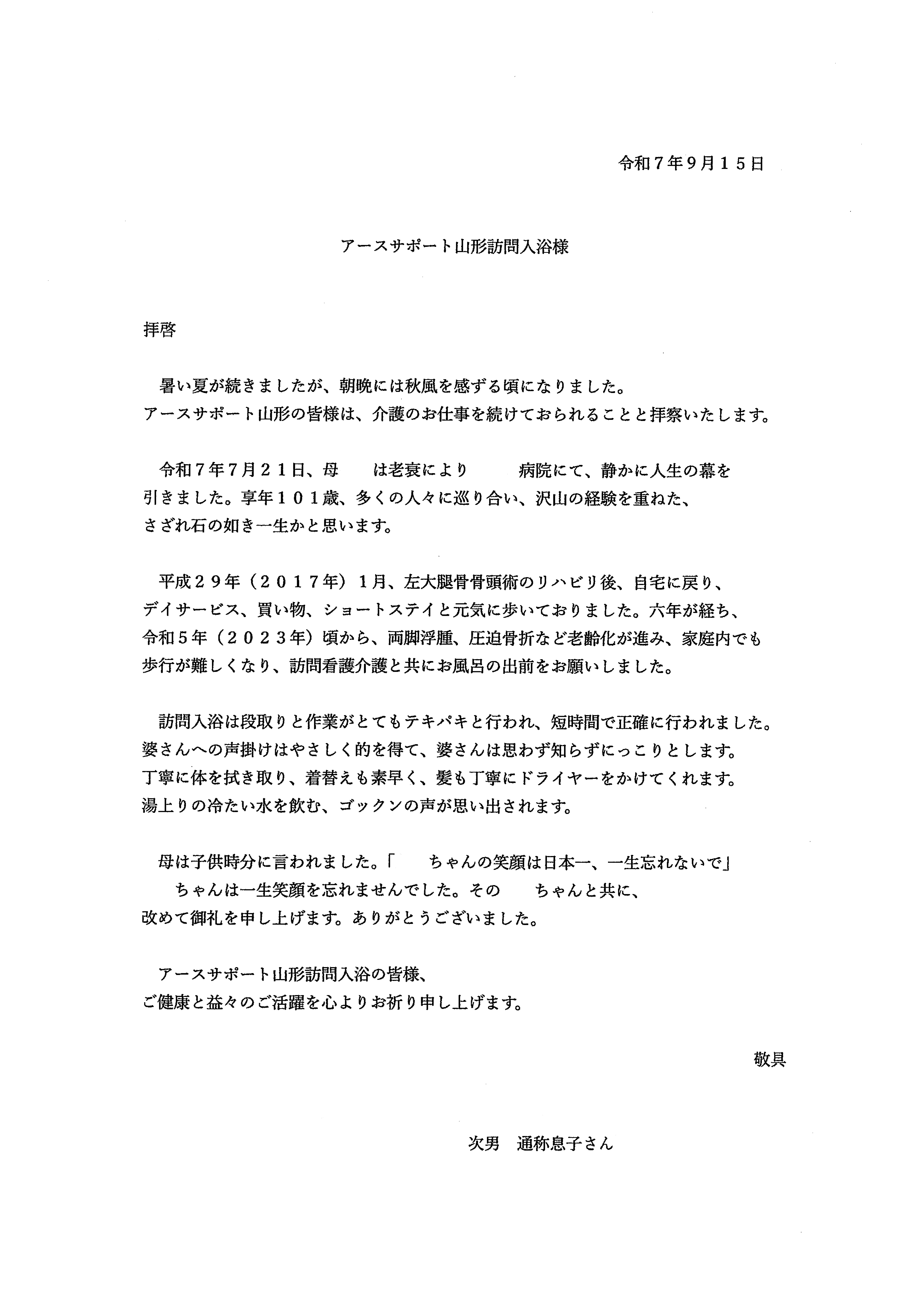 今回は、山形県にある「アースサポート山形」の訪問入浴をご利用いただいたお客様からのお手紙をご紹介します。