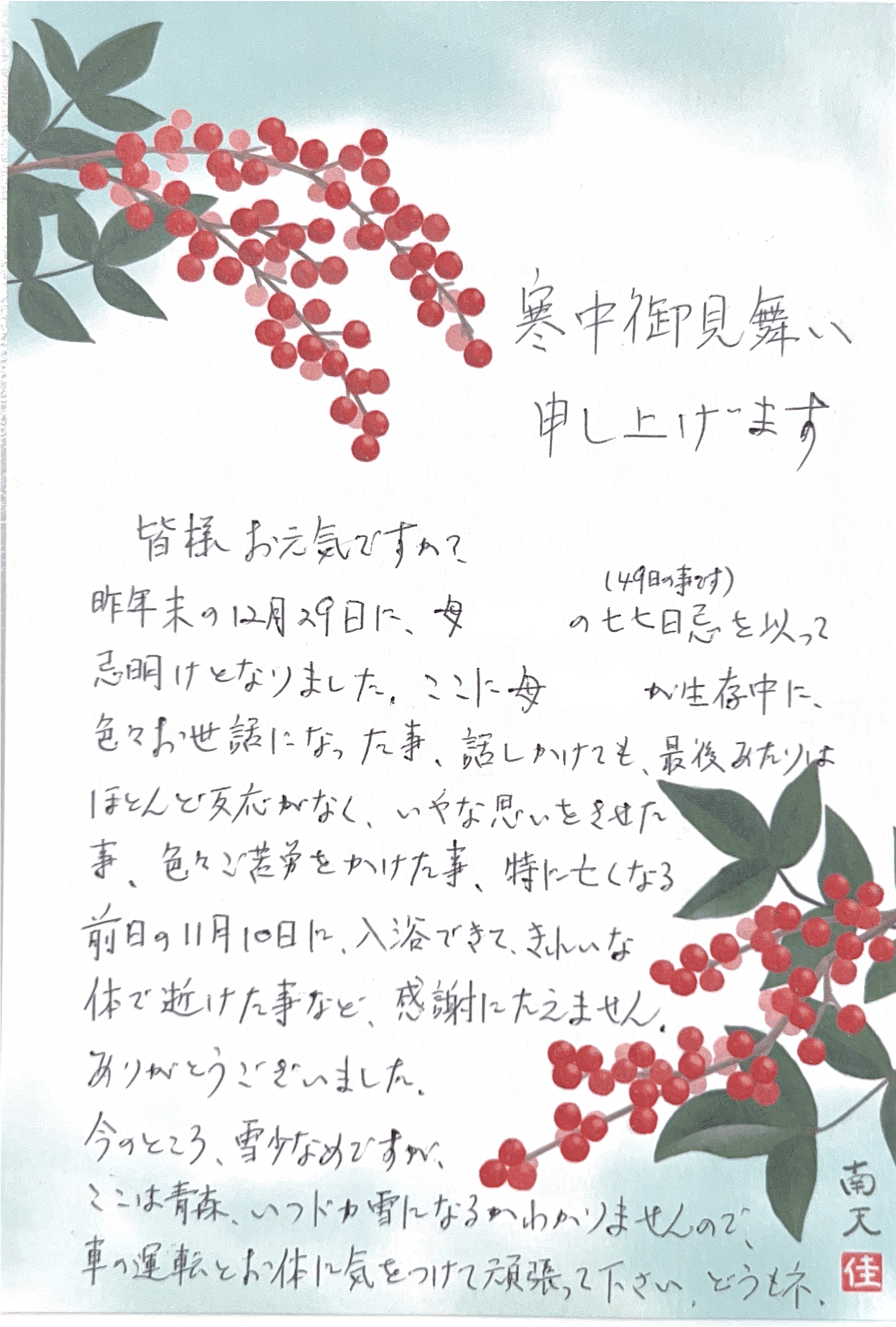今回お手紙をくださったお客様は、皮膚の乾燥と感覚過敏が重なることで痒みの訴えが強くあり、ご自身で引っ搔いてしまうことがありました。薬を使用しても痒みを取り除くことは難しく、心身の疲労が続く中、少しでも気持ちを和らげたいと思い、「初詣で痒みが治るようにお願いしておきますね」とお伝えすると、ほっとした表情を見せていただきました。その後も、「あずましく(津軽弁で「心地よい、安心できる」という意味。)眠れるように痒みを取っていきますね!」と前向きな声かけを意識していました。治すことはできなくても、声かけなどの”心を向ける時間”が安心につながり、支えになることができると改めて気付くきっかけになりました。