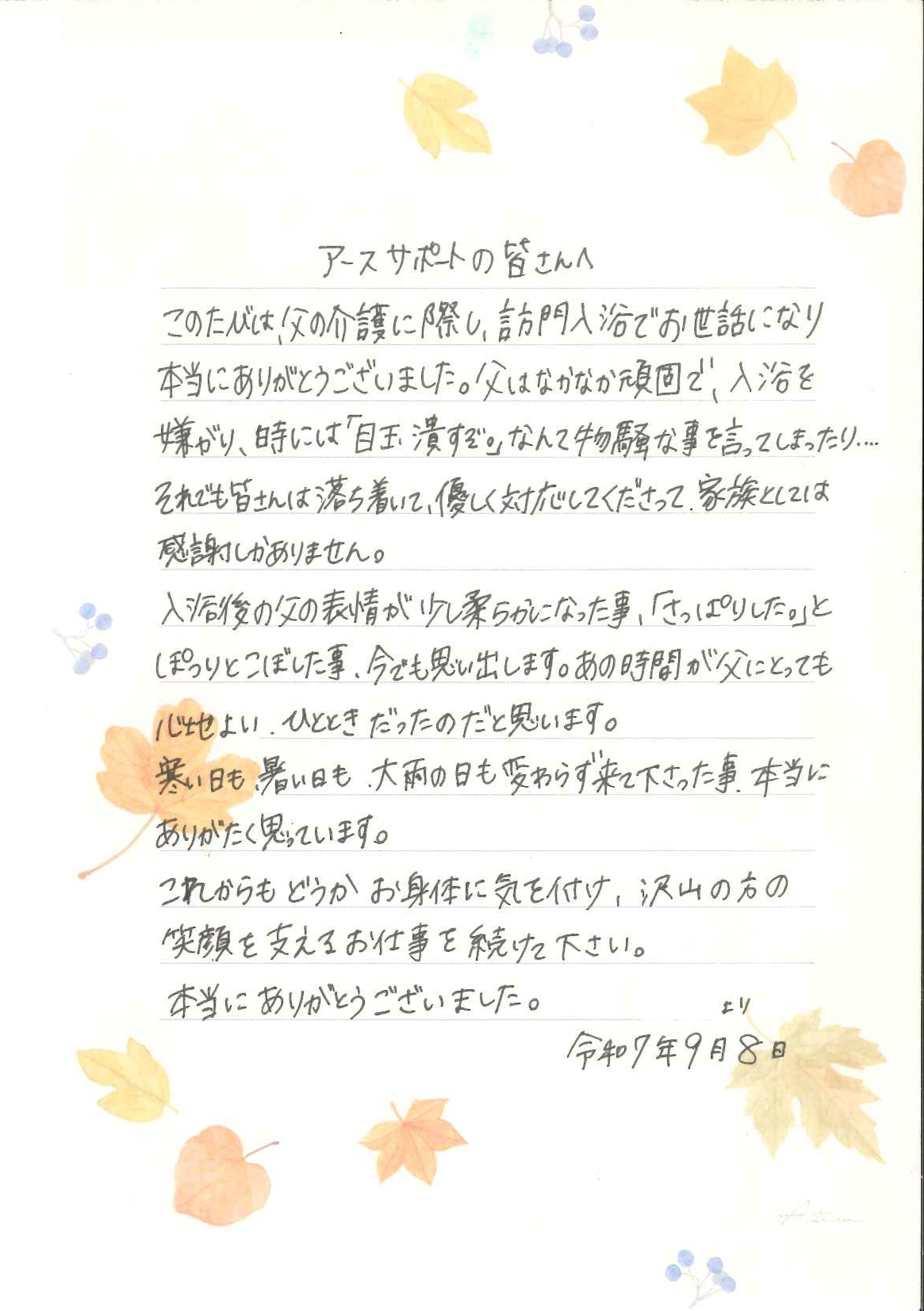 今回は、栃木県にある「アースサポート那須」の訪問入浴をご利用いただいたお客様からのお手紙をご紹介いたします。