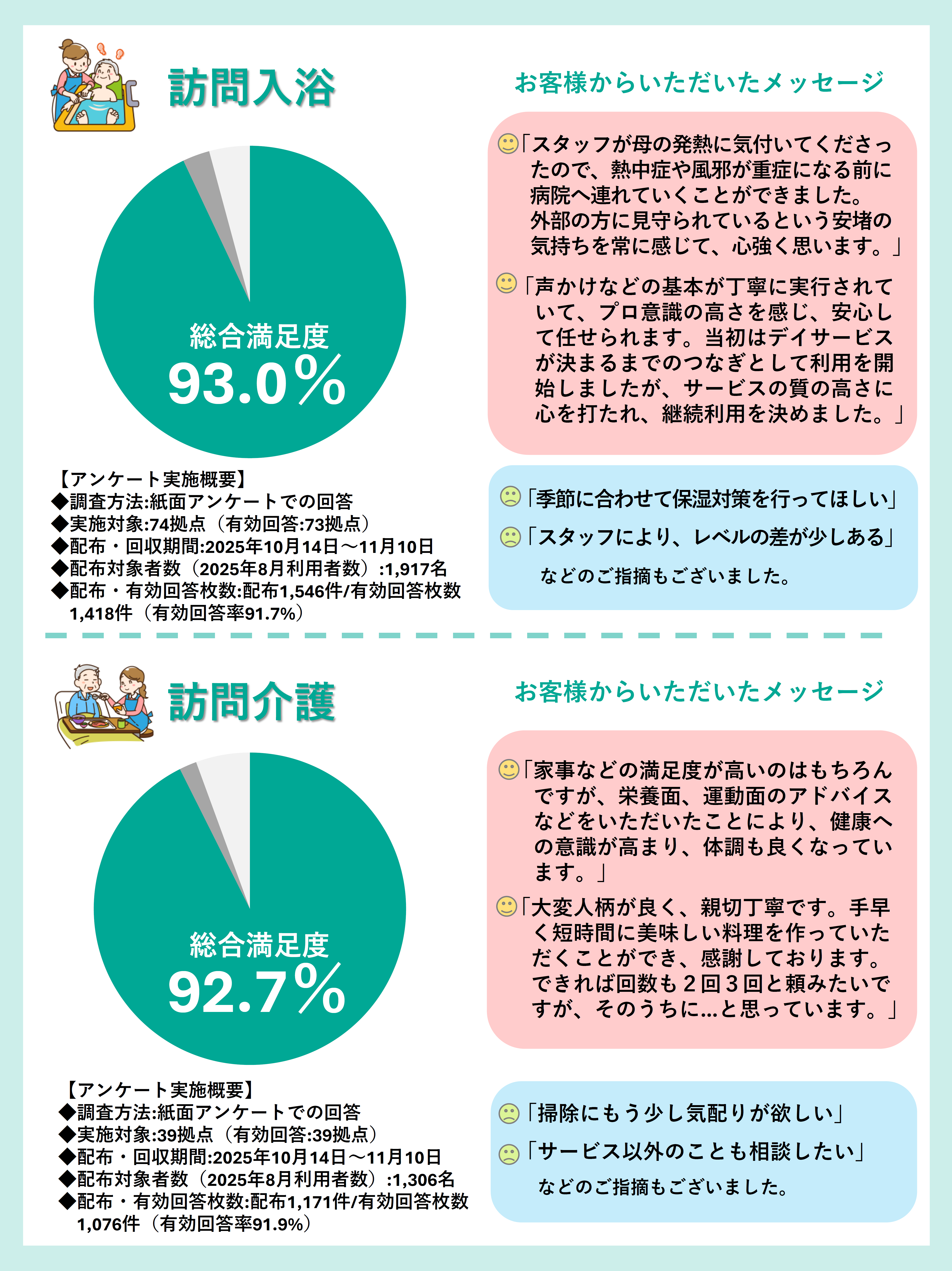今回は、訪問入浴サービス、訪問介護サービス、通所介護サービス、居宅介護支援サービスに関するアンケート結果をご報告いたします。