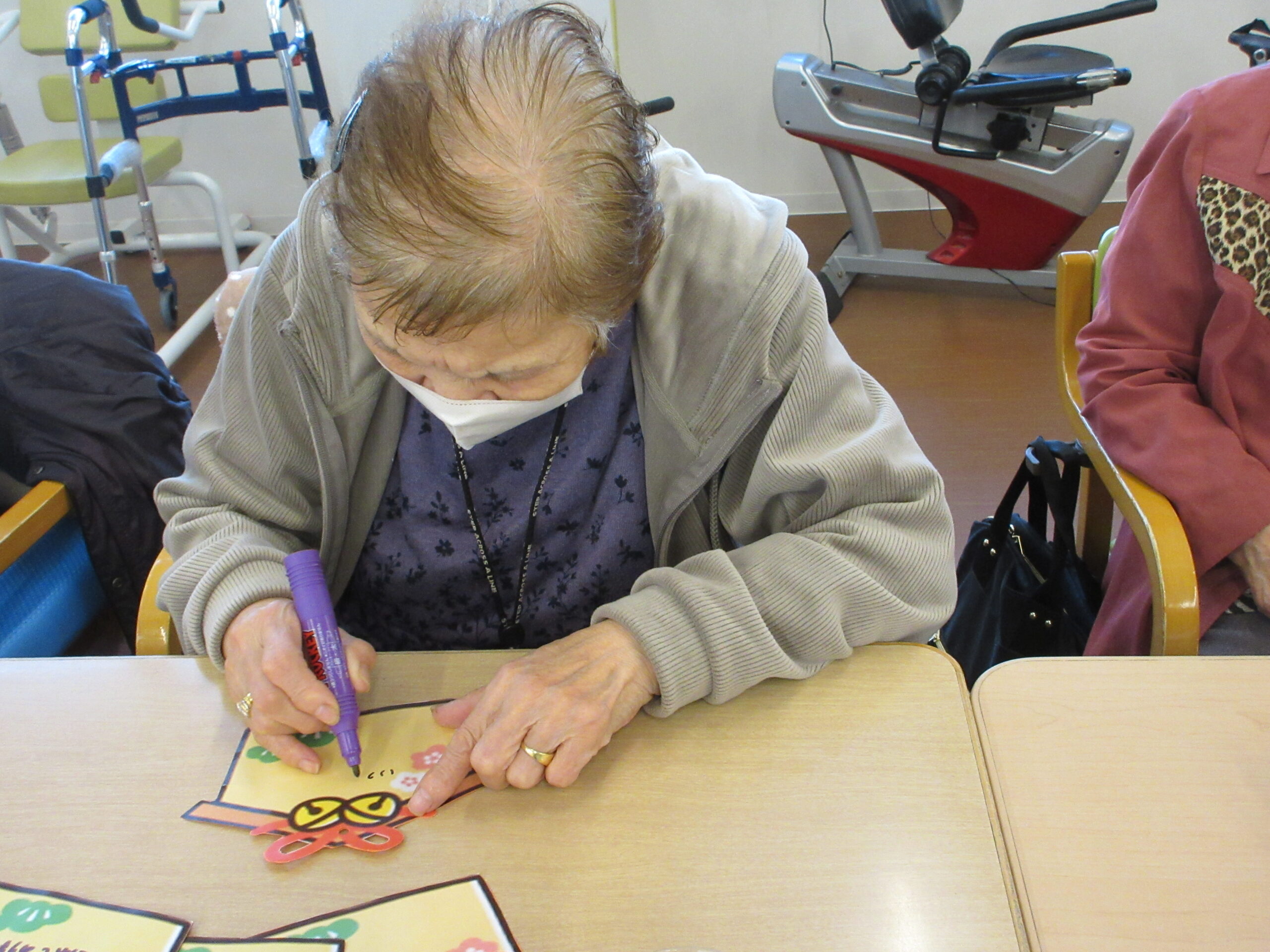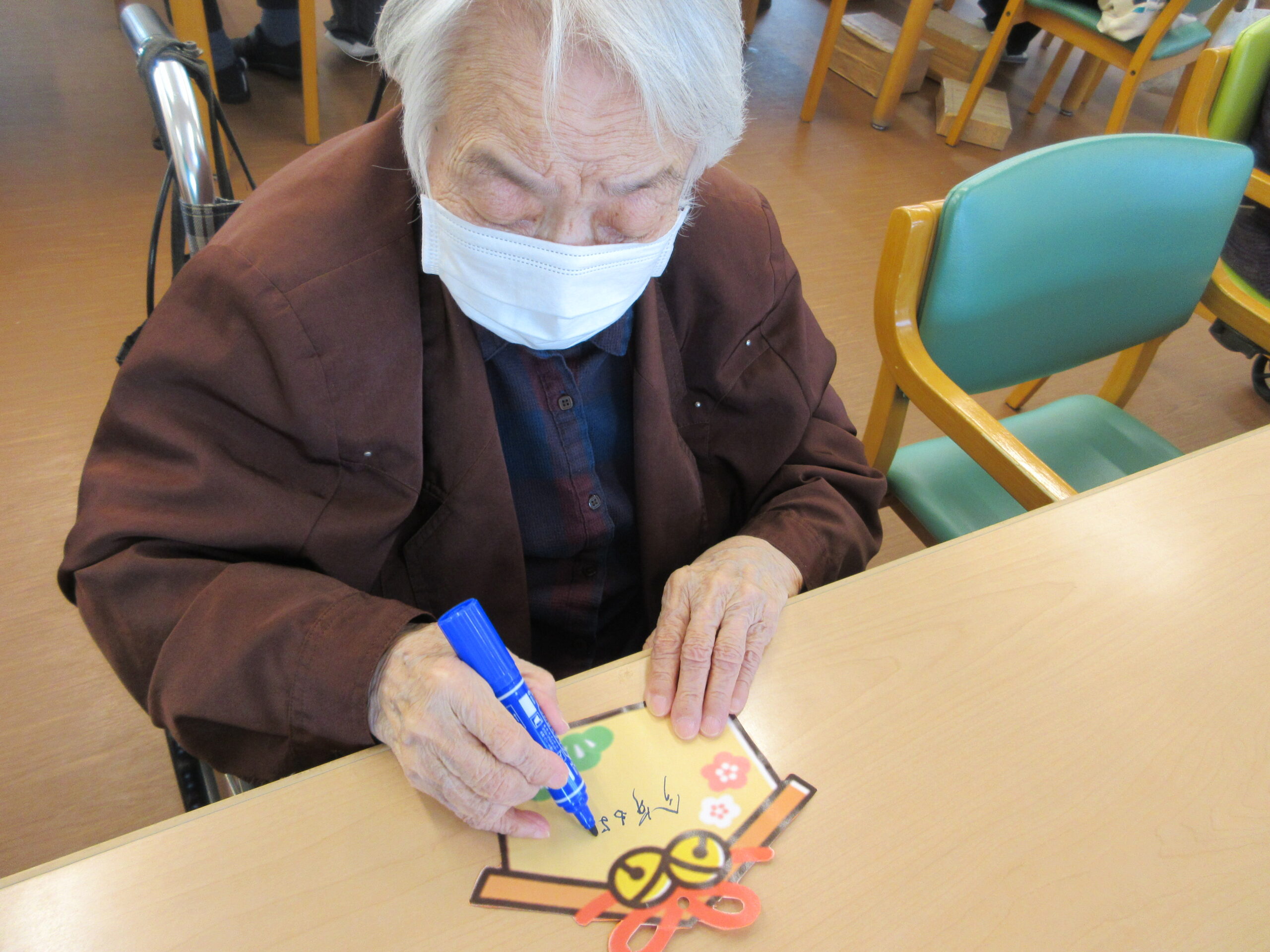 絵馬飾りレクを通して、お客様が今年1年の希望や願いを考える機会を作ることができました。ご自身の想いを文字にすることにより、気持ちが前向きになり、日々の生活への活力にも繋がることと思います。また、完成した絵馬を見せ合いながら笑顔や会話が広がる、温かく楽しい時間をお過ごしいただくことができました。
