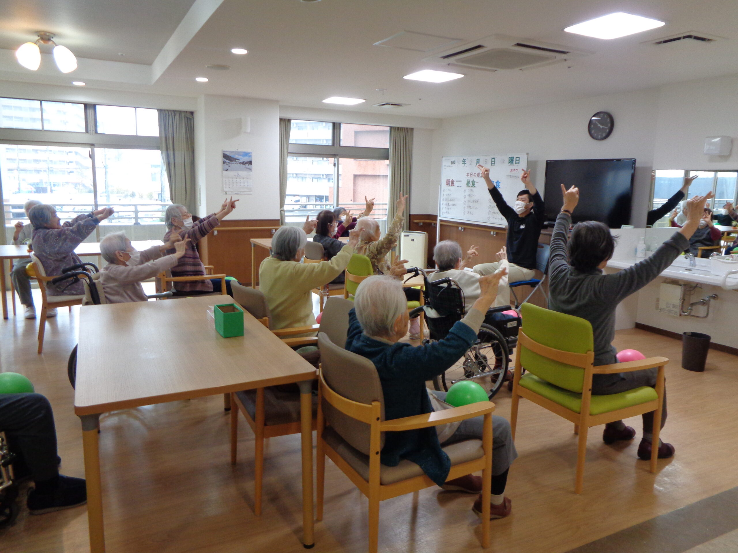1日のプログラムの中に身体を動かす機会を多く取り入れ、ご自宅での生活が長く続けられるようにサポートさせていただいています。朝の会・帰りの会では生活機能訓練を取り入れた体操、昼食前には口腔体操、おやつ前にはエルダー体操で楽しく筋力トレーニングなどを行い、各15分程度で無理なく続けています。